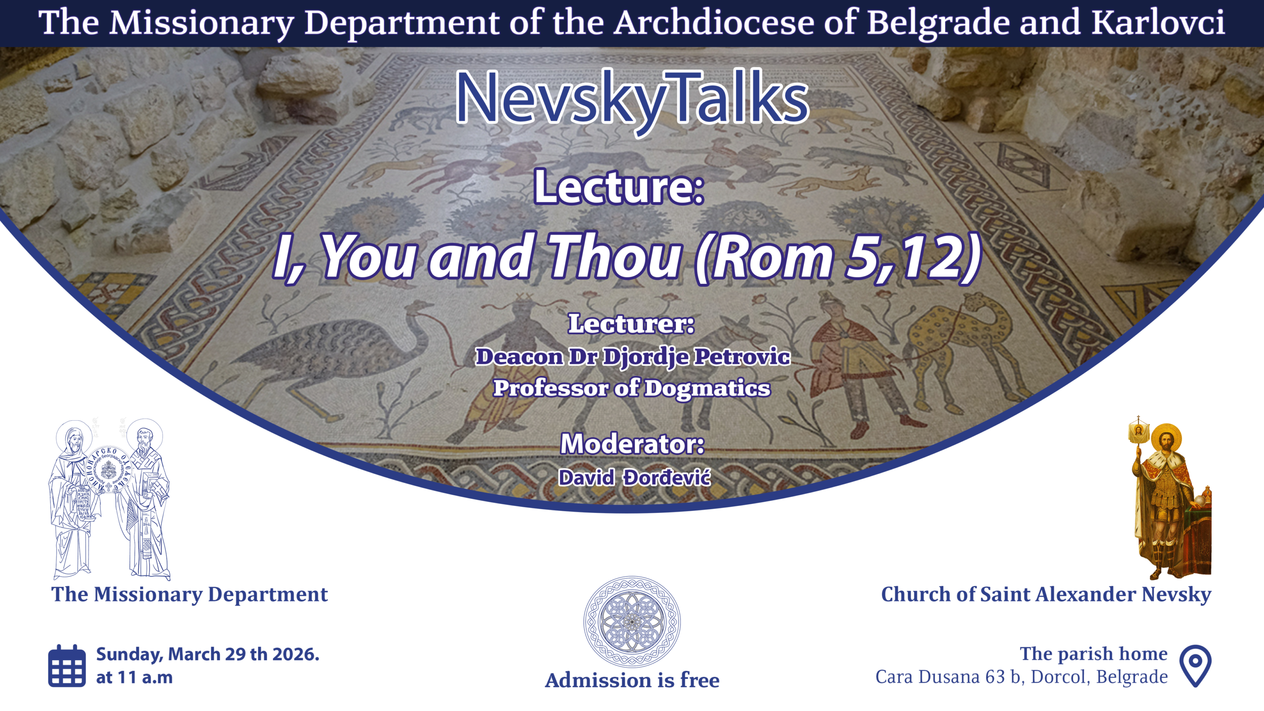 On Sunday, March, 29, 2026, at 11 AM after the Liturgy, a lecture titled “I, You and Thou (Rom 5,12)” will be delivered in English at the Missionary Department, in the parish hall of St. Alexander Nevsky Church. It will be presented by our brother in Christ, Deacon Dr Djordje Petrovic. The moderator is David Djordjević.