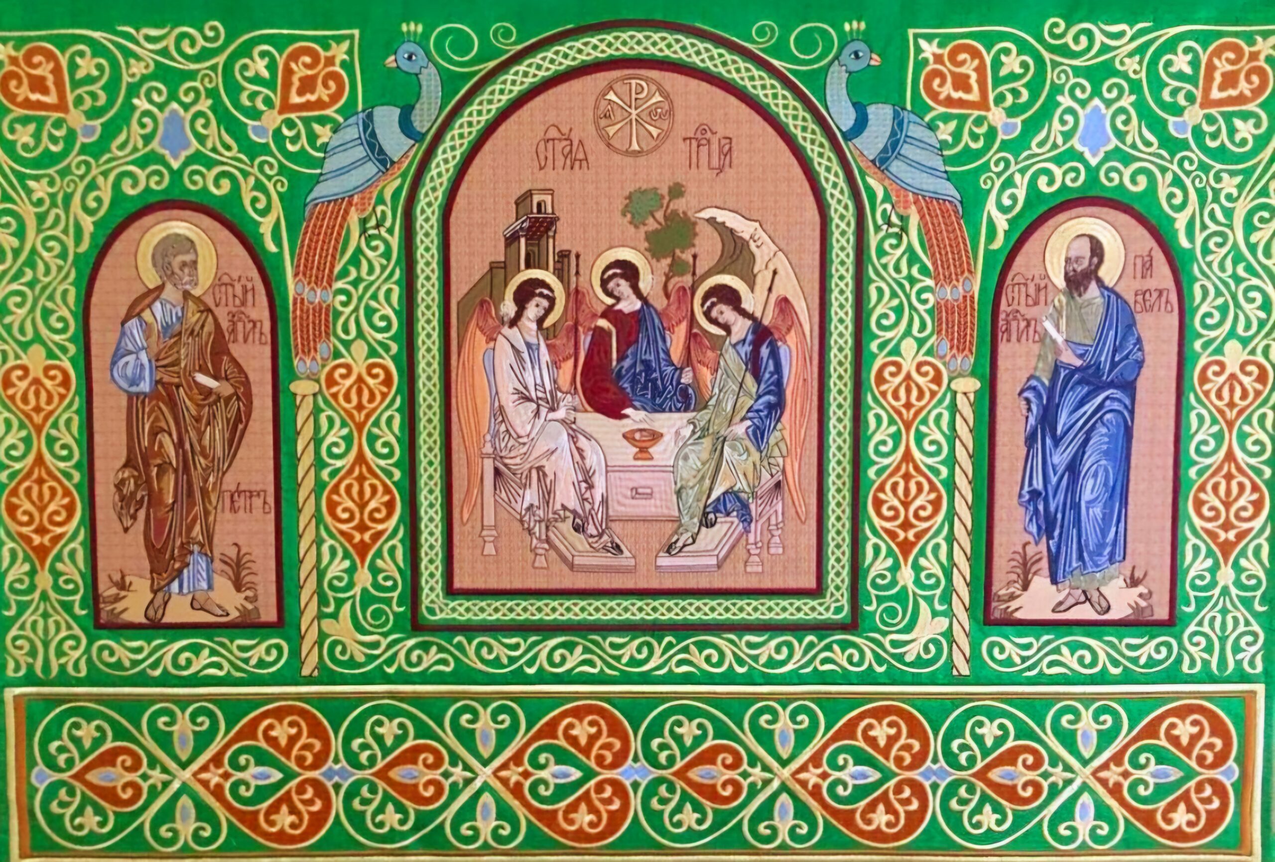 On the day of Pentecost, the mystery of the Holy Trinity was revealed. God—one in essence and three in persons—is Love. Divine love has been poured into the hearts of the faithful by the Holy Spirit through the Son. Prayers to the Holy Trinity accompany a person from birth to death. The first words spoken by the Church to a newborn are: “In the name of the Father and of the Son and of the Holy Spirit.” The infant is baptised “in the name of the Father and of the Son and of the Holy Spirit.” In the sacrament of Chrismation, the Church seals the newly baptised with “the gift of the Holy Spirit.” For those who genuinely repent, sins are forgiven in the sacrament of Confession—“in the name of the Father and of the Son and of the Holy Spirit.” The sacrament of Marriage is celebrated in the name of the Holy Trinity. The priest’s final prayer at the funeral ends with the glorification of the Holy Trinity.