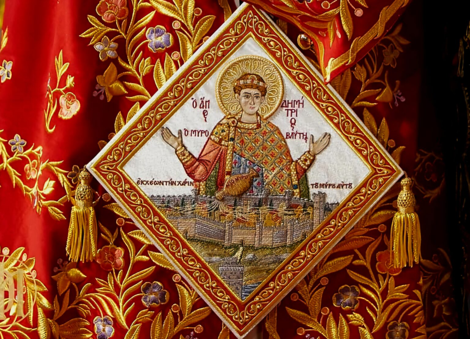 The Church’s hymnographer calls Saint Demetrius the crowned one among the martyrs. Thus in the festal troparion we glorify God’s saint, Saint Demetrius the Great-Martyr, wonderworker and myrrh-streamer of Thessaloniki, with the following words: “In afflictions the whole world found in you a great protector, O martyr who overcomes the multitudes of idolaters. As you destroyed Lyaios’ pride and strengthened Nestor for the contest, so pray, O Saint Demetrius, to Christ our God that He may grant us great mercy.”